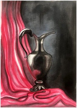 The scene of a graceful vase rests in the quiet shadow with a crimson drapery adds warmth and depth creating a timeless sense of elegance.