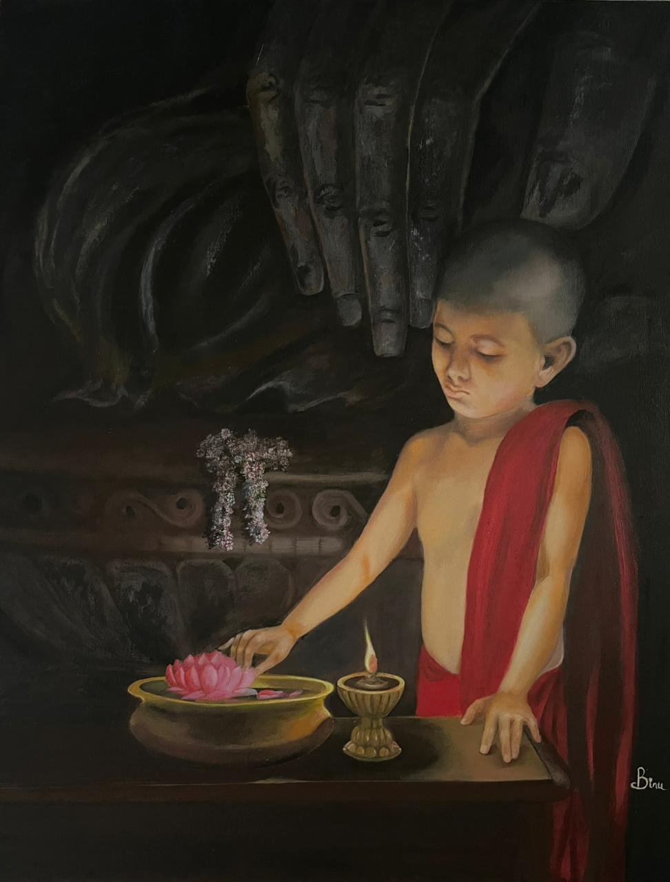 The image captures the purity of a child’s offering where faith is unburdened by complexity and ritual is born from sincerity. The lotus symbol of enlightenment, rests in his care, while the flame reflects the light of awareness kindled within him. The Buddha’s silent hand above is not heavy but sheltering as though to say “Every small act of devotion carries infinite grace”